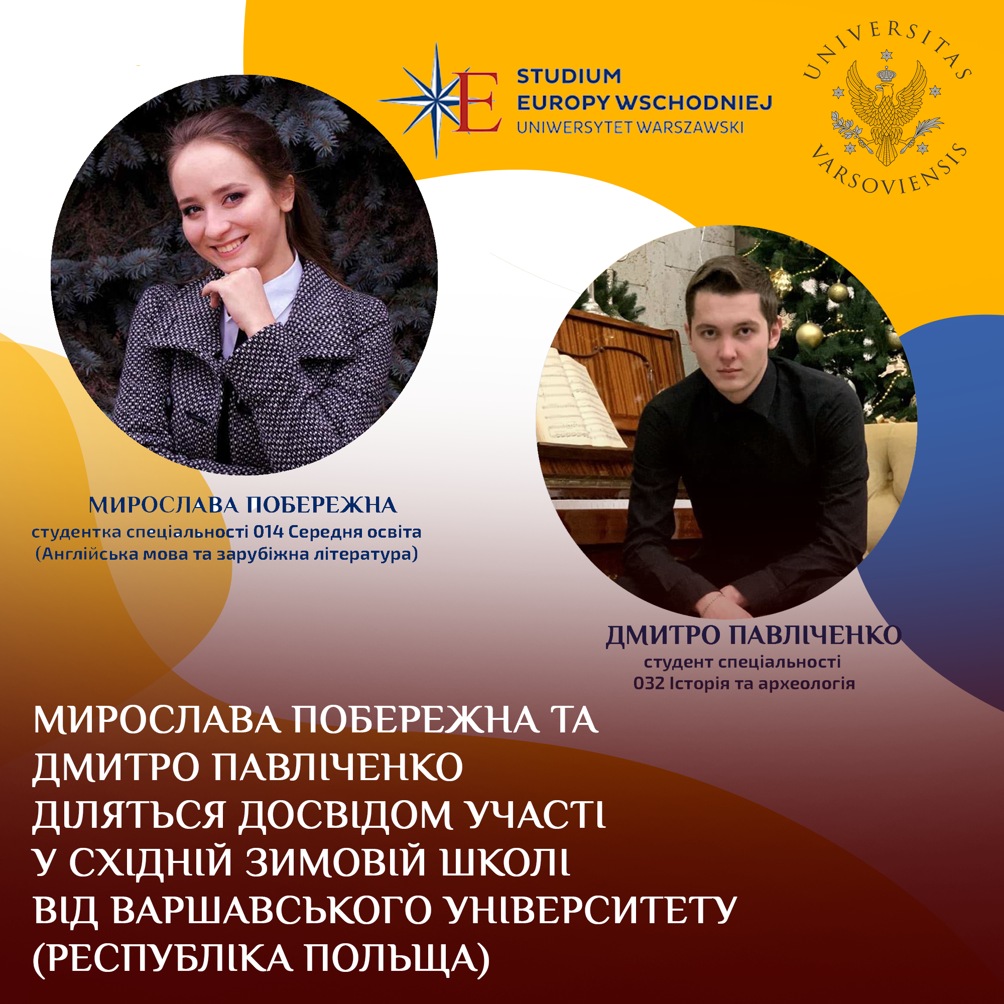 24 березня на платформі Google Meet відбулась зустріч із Мирославою Побережною, студенткою спеціальності 014 Середня освіта (Англійська мова та зарубіжна література), та Дмитром Павліченком, студентом спеціальності 032 Історія та археологія, які з 28 лютого по 14 березня реалізовували свою мобільність як учасники Східної зимової школи, організованої Центром Східноєвропейських студій Варшавського університету (Республіка Польща).
