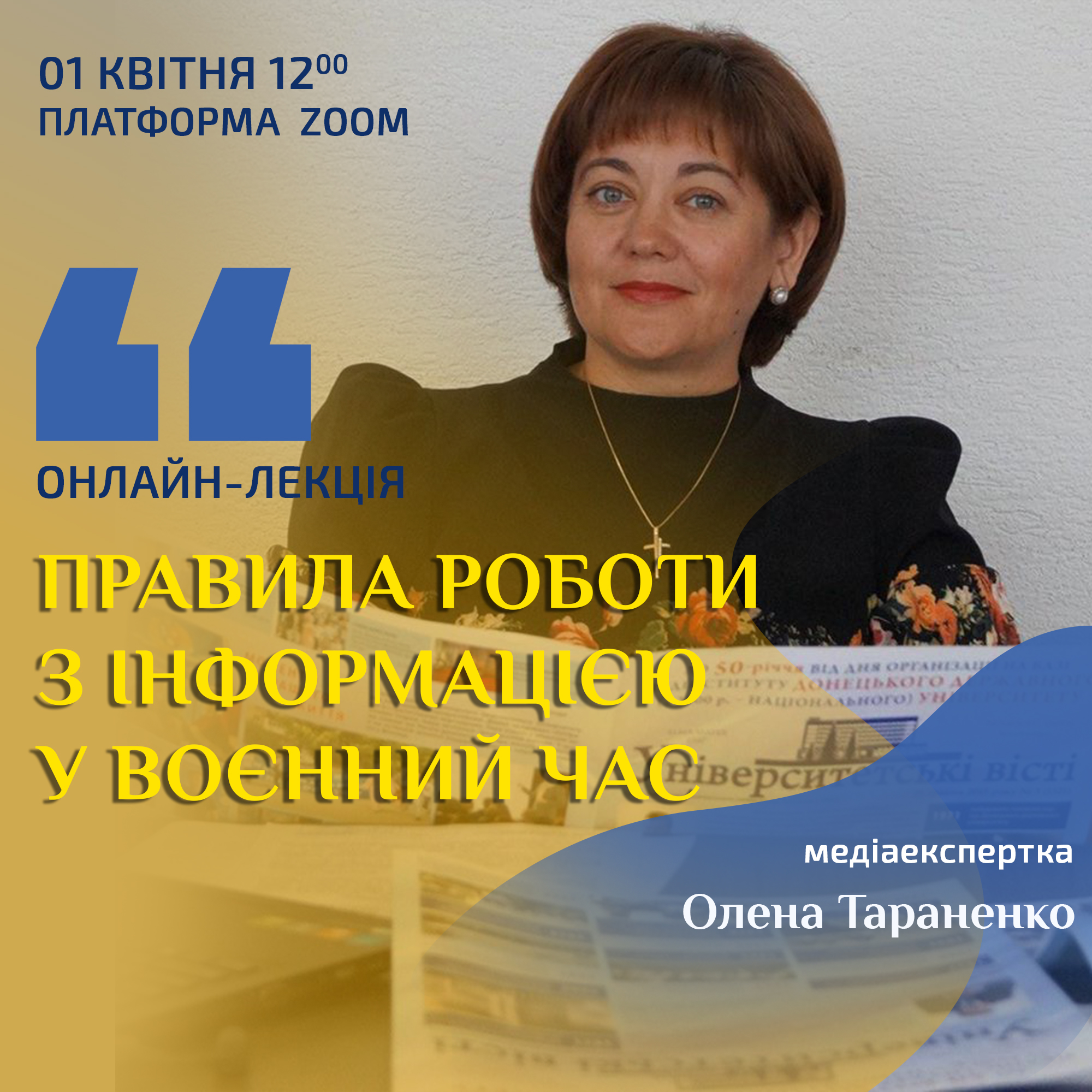 Запрошуємо всіх охочих на онлайн-лекцію від медіаекспертки Олени Тараненко «Правила роботи з інформацією у воєнний час», яка відбудеться 01 квітня о 12.00 на платформі  Zoom.