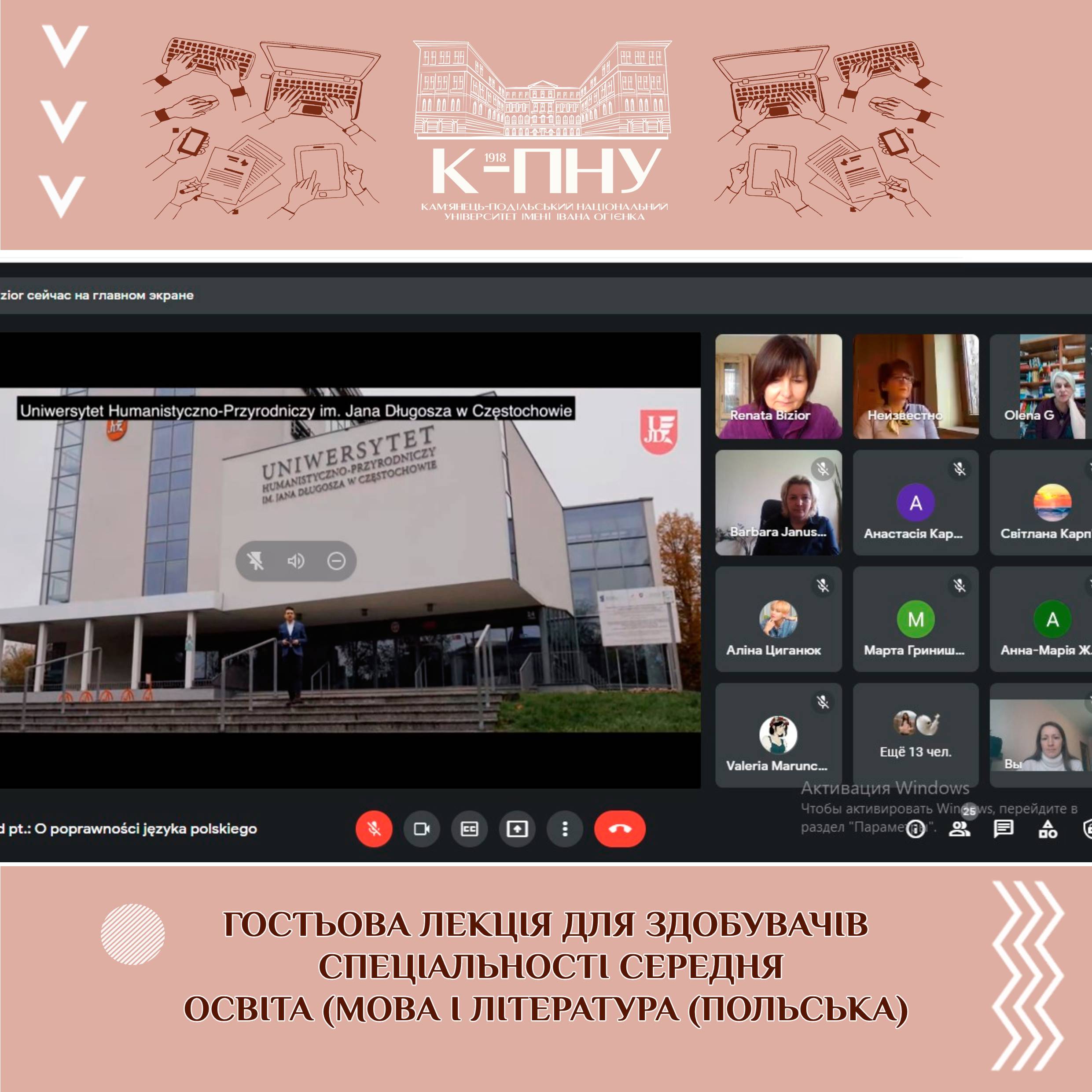 09 грудня здобувачі вищої освіти К-ПНУ, які вивчають польську мову, мали змогу взяти участь у гостьовій онлайн-лекції, яку провели представники Інституту Мовознавства Гуманістично-Природничого Університету імені Яна Длугоша в Ченстохові (Польща) професор доктор Рената Бізьор та професор докторр Дорота Суска.