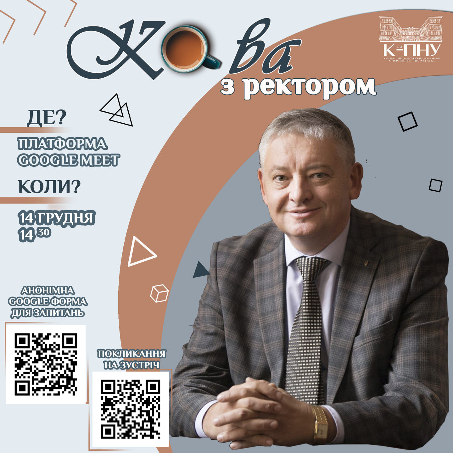 Неформальна зустріч із ректором у межах проєкту «КАВА З РЕКТОРОМ» online! Участь у проєкті можуть узяти всі охочі представники студентства. Під час зустрічі ви матимете можливість поспілкуватися з ректором К-ПНУ СЕРГІЄМ КОПИЛОВИМ, висловити свої думки щодо організації освітнього процесу в університеті, запропонувати бачення розвитку студентського дозвілля у виші, а також почути відповіді на питання, які вас цікавитимуть.