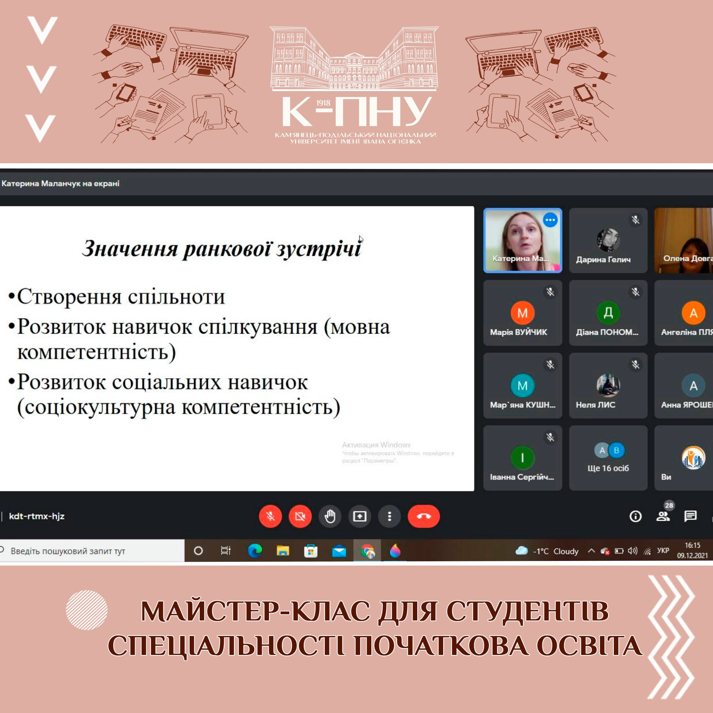 09 грудня для здобувачів вищої освіти спеціальності 013 Початкова освіта вчитель початкових класів НВК №13 Катерина Маланчук провела майстер-клас “Підготовка майбутніх учителів до проведення ранкових зустрічей у початковій школі”.