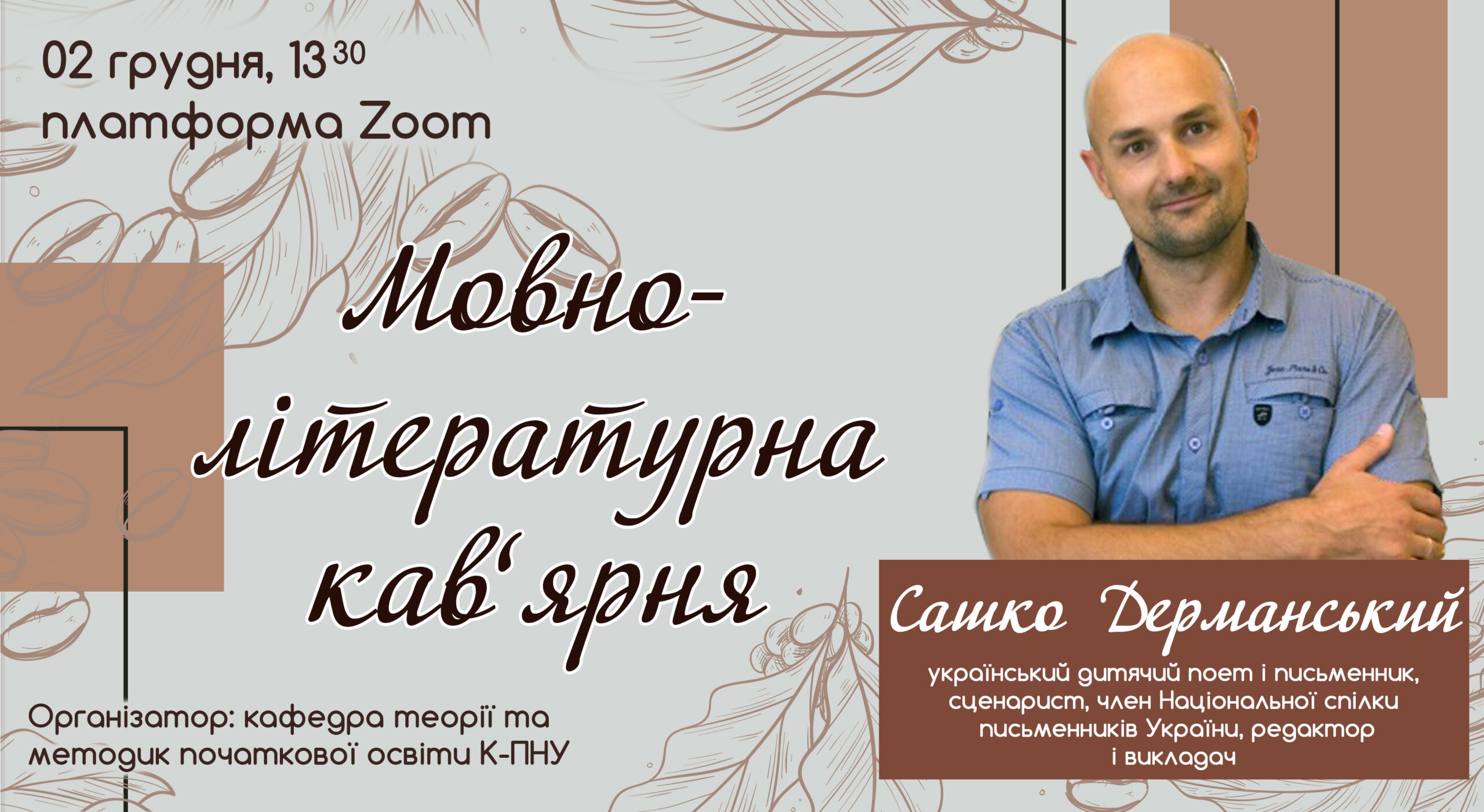 Запрошуємо всіх охочих долучитися до чергової зустрічі в межах проєкту “Мовно-літературна кав’ярня”, яка відбудеться 02 грудня о 13:30 на платформі Zoom. Гість зустрічі – Сашко Дерманський, український дитячий поет і письменник, сценарист, член Національної спілки письменників України, редактор і викладач.