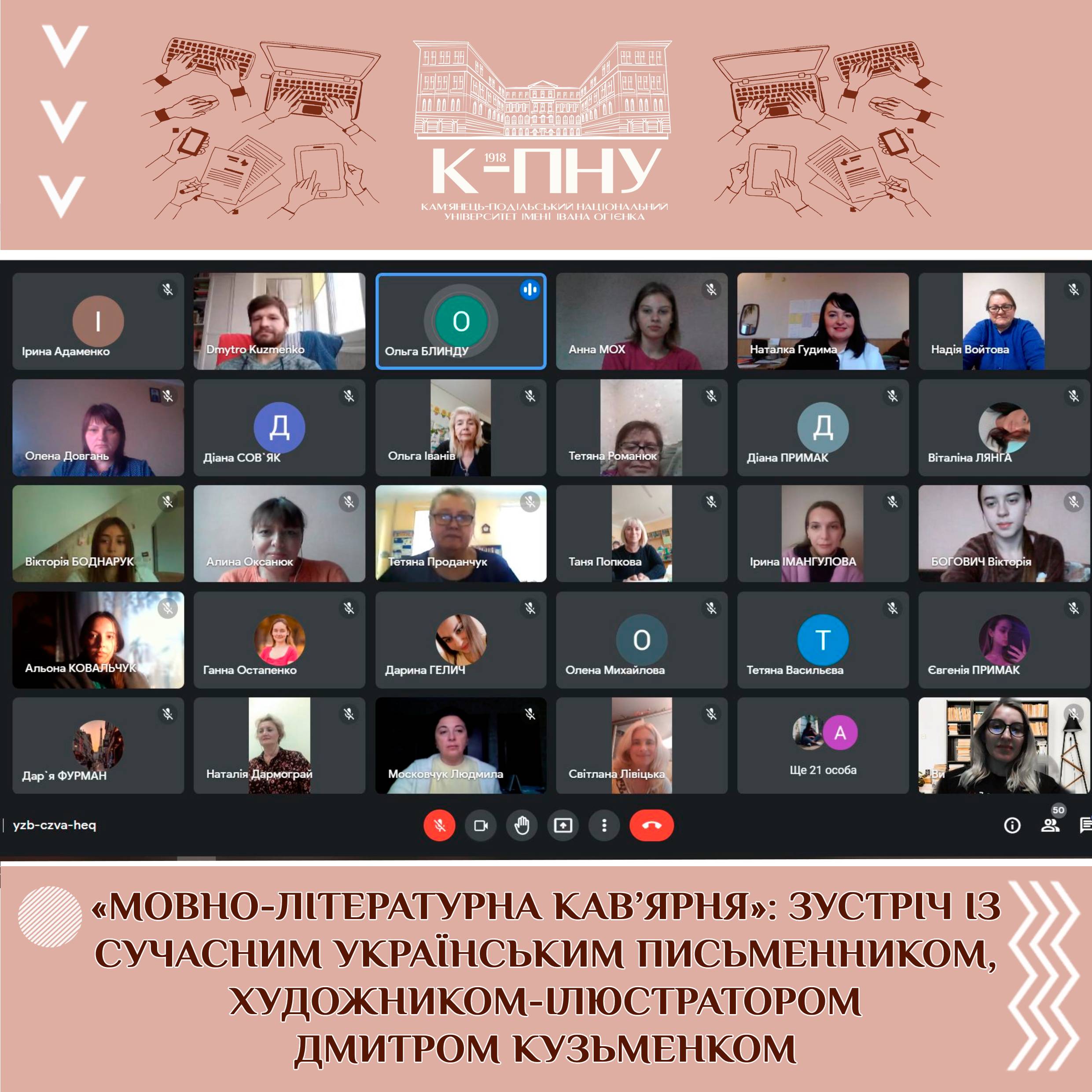 Кафедра теорії та методик початкової освіти Кам’янець-Подільського національного університету імені Івана Огієнка продовжує цикл зустрічей із сучасними українськими письменниками дитячої літератури. 18 листопада відбувся черговий онлайновий захід у форматі мовно-літературної кав’ярні. Гостем зустрічі був сучасний український письменник, художник-ілюстратор, редактор Дмитро Кузьменко (псевдонім – Кузько Кузякін). До кав’ярні завітали здобувачі вищої освіти спеціальності Початкова освіта К-ПНУ, учителі початкових класів і бібліотекарі м. Кам’янця-Подільського, Дунаївців, Хотина.