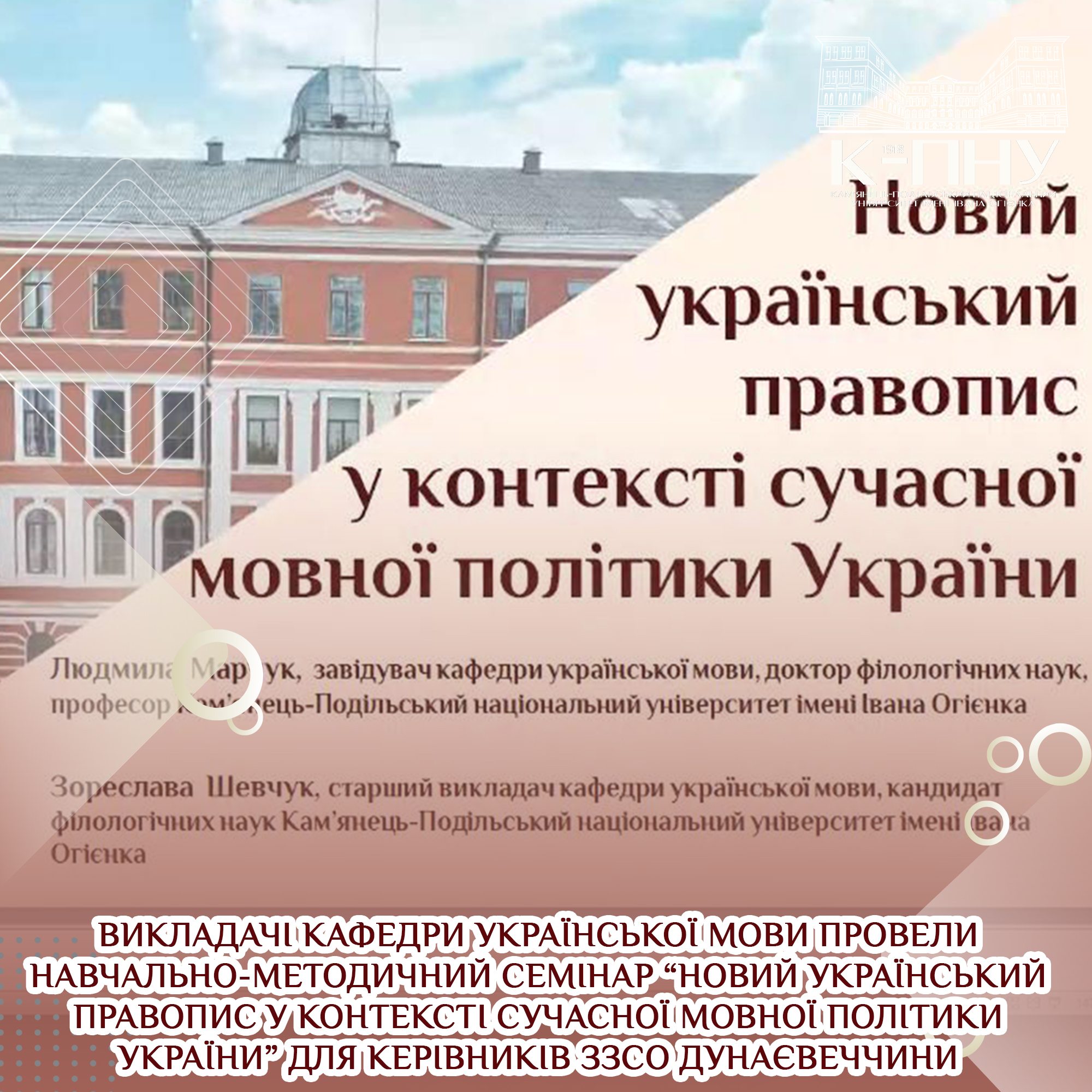 Формування мовної культури під час виконання професійних обов’язків є запорукою становлення успішного керівника закладу освіти. Уміння правильно, точно, логічно, майстерно використовувати мовні норми та засоби залежно від мети і ситуації спілкування – невід’ємний складник усебічно розвиненої особистості. З огляду на актуальність окресленої теми 17 листопада науково-педагогічні працівники кафедри української мови – завідувач кафедри, доктор філологічних наук, професор Людмила Марчук і старший викладач кафедри, кандидат філологічних наук Зореслава Шевчук, спільно з Комунальною установою Дунаєвецької міської ради “Центр професійного розвитку педагогічних працівників” організувати і провели навчально-методичний семінар “Новий український правопис у контексті сучасної мовної політики України”. Участь у заході взяли заступники директорів і директори закладів загальної середньої освіти Дунаєвеччини та всі охочі.