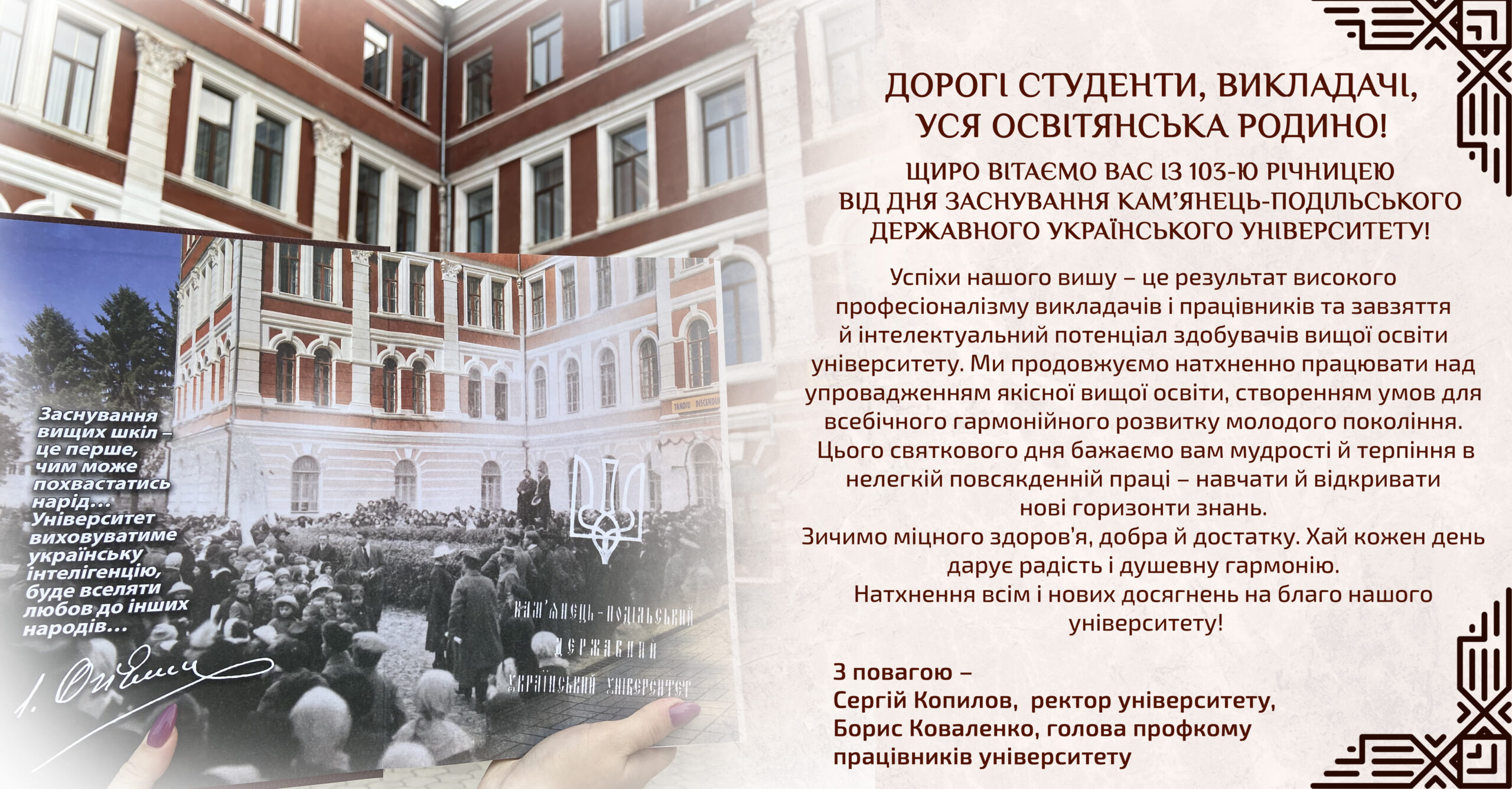 Запрошуємо 22 жовтня на урочистий молебень із нагоди 103-ої річниці від дня заснування К-ПНУ, який відбудеться біля каплиці Храму Різдва Христового (історичний факультет, вул. Татарська, 14). Початок о 8:00 год.