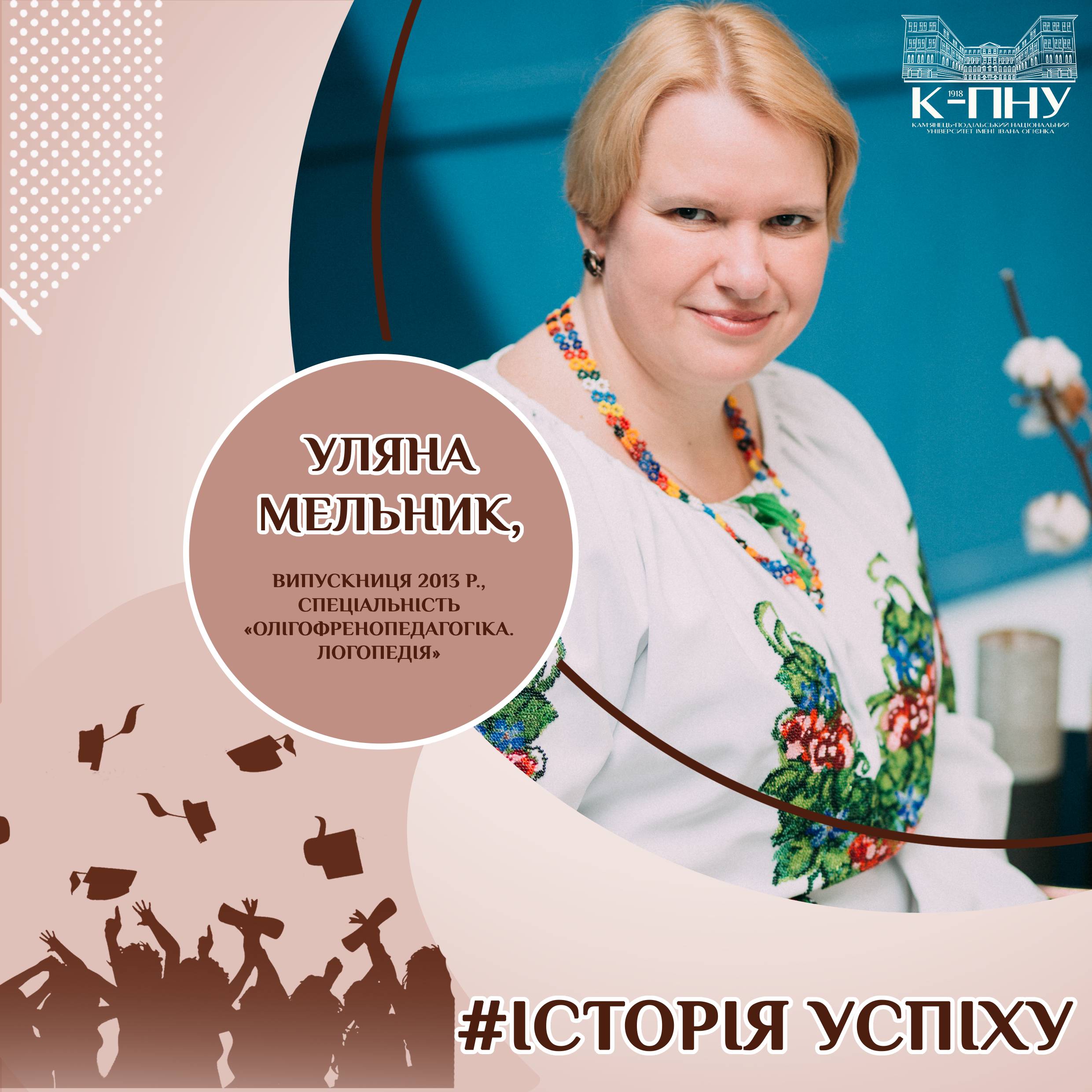 Уляна Мельник, випускниця К-ПНУ 2013 р., спеціальність «Олігофренопедагогіка. Логопедія» (ІІ вища освіта), заступник директора з питань проведення експерименту КЗ ЛОР Навчально-реабілітаційного центру І-ІІ ст. «Довіра».