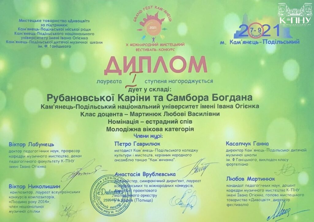 Каріна Рубановська і Богдан Самбор – лауреати X Міжнародного фестивалю-конкурсу “Grand Fest Кам’янець-весна 2021»