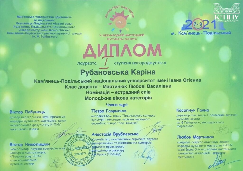 Щиро вітаємо студентів спеціальності Музичне мистецтво Каріну Рубановську (1 курс) та вокальний дует у складі Богдана Самбора (2 курс) і Каріни Рубановської, які стали лауреатами X Міжнародного фестивалю-конкурсу “Grand Fest Кам‘янець-весна 2021» та отримати дипломи І ступеня.
