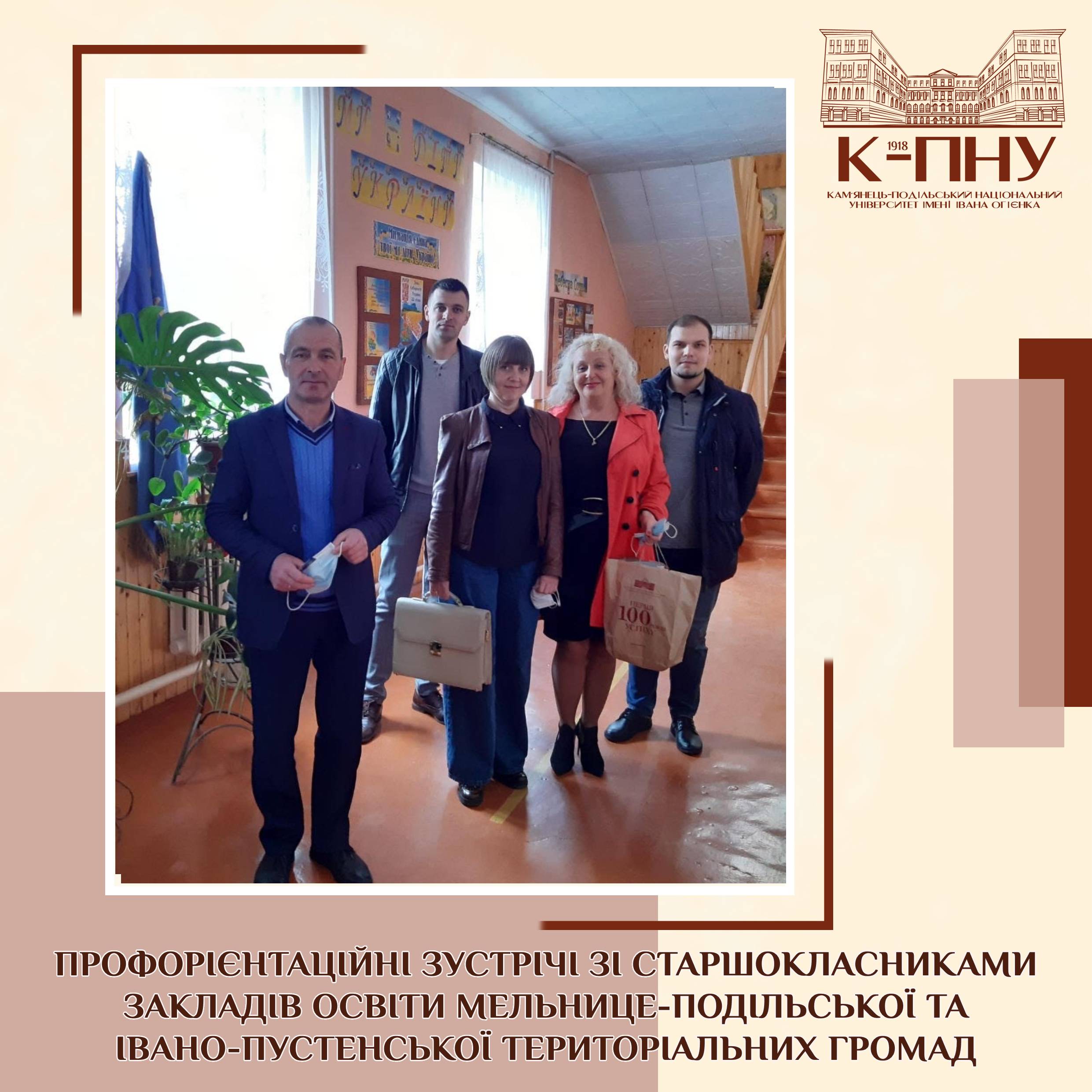 Наталія Дворніцька, заступник декана з виховної та профорієнтаційної роботи факультету іноземної філології, Інна Любинська, старший викладач кафедри географії та методики її викладання, Владистав Гарбар, старший викладач кафедри географії та методики її викладання та Максим Сльозкін, магістрант історичного факультету, провели профорієнтаційні зустрічі у Дзвиняцькій, Мельнице-Подільській, Івано-Пустенській, Гермаківській, Кривченській загальноосвітніх школах І-ІІІ ступенів. Абітурієнтам розповіли про особливості навчання в К-ПНУ та про особливості вступної кампанії 2021, спеціальності, за якими здійснюють підготовку фахівців в університеті. Щирість учителів і старшокласників, їхня зацікавленість та усвідомлення того, наскільки важлива вища освіта сьогодні, викликають сподівання, що влітку найкращі з них стануть студентами К-ПНУ.