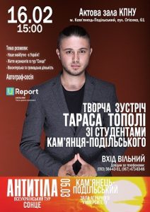16 лютого 2017 р. у приміщенні Кам’янець-Подільського національного університету імені Івана Огієнка в рамках тематичних поїздок Україною відбудеться творча зустріч лідера гурту АНТИТІЛА Тараса Тополі зі студентами та шанувальниками. Читати далі