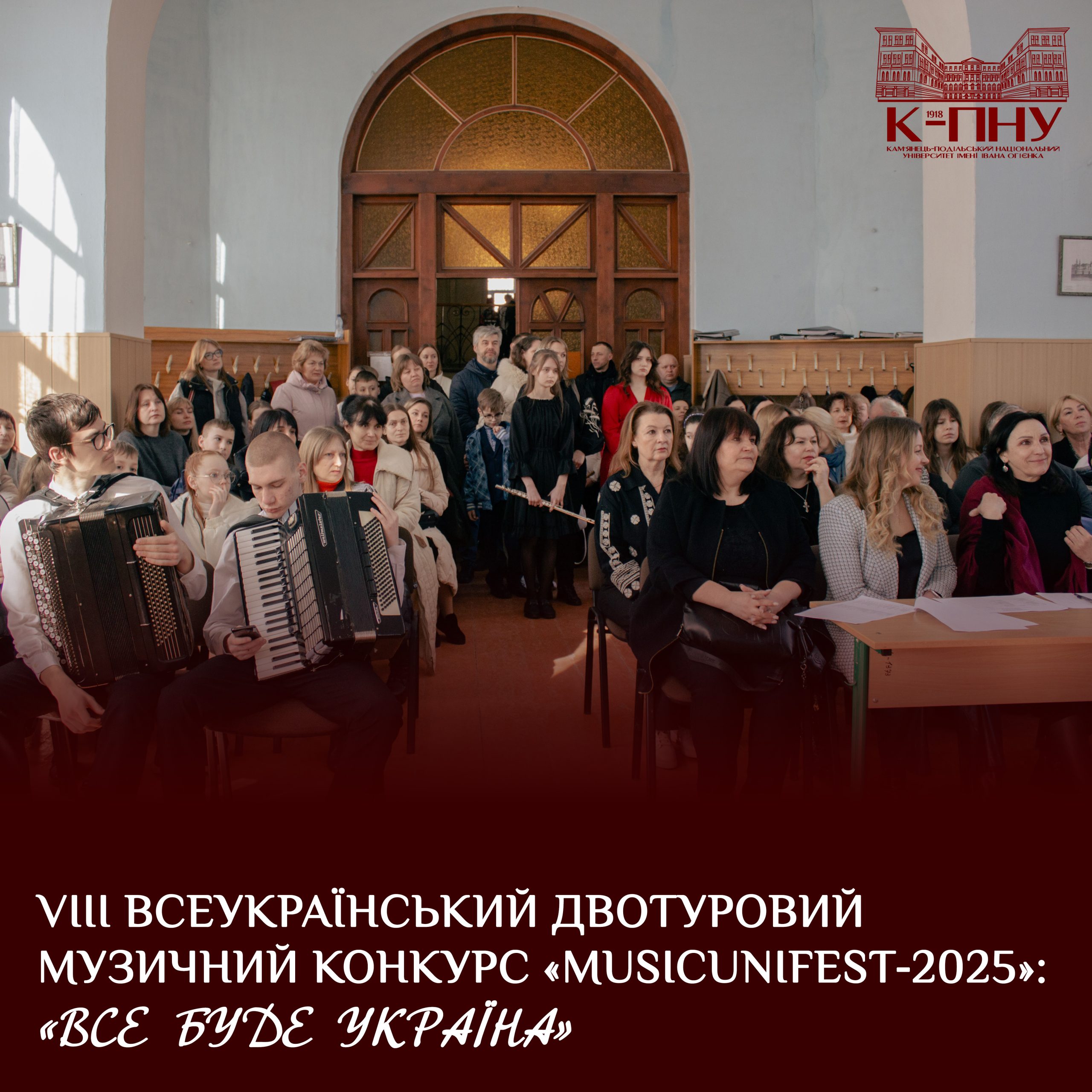19-21 березня на базі кафедри музичного мистецтва К-ПНУ відбувся VIII Всеукраїнський двотуровий музичний конкурс «MusicUniFest-2025» під гаслом «Все буде Україна». Щороку конкурс збирає талановиту молодь із різних куточків України і, не зважаючи на складні обставини, його географія продовжує розширюватися. Цьогоріч участь у конкурсі взяли понад 190 номінантів очної форми та 20 дистанційних учасників із 7 областей України.
