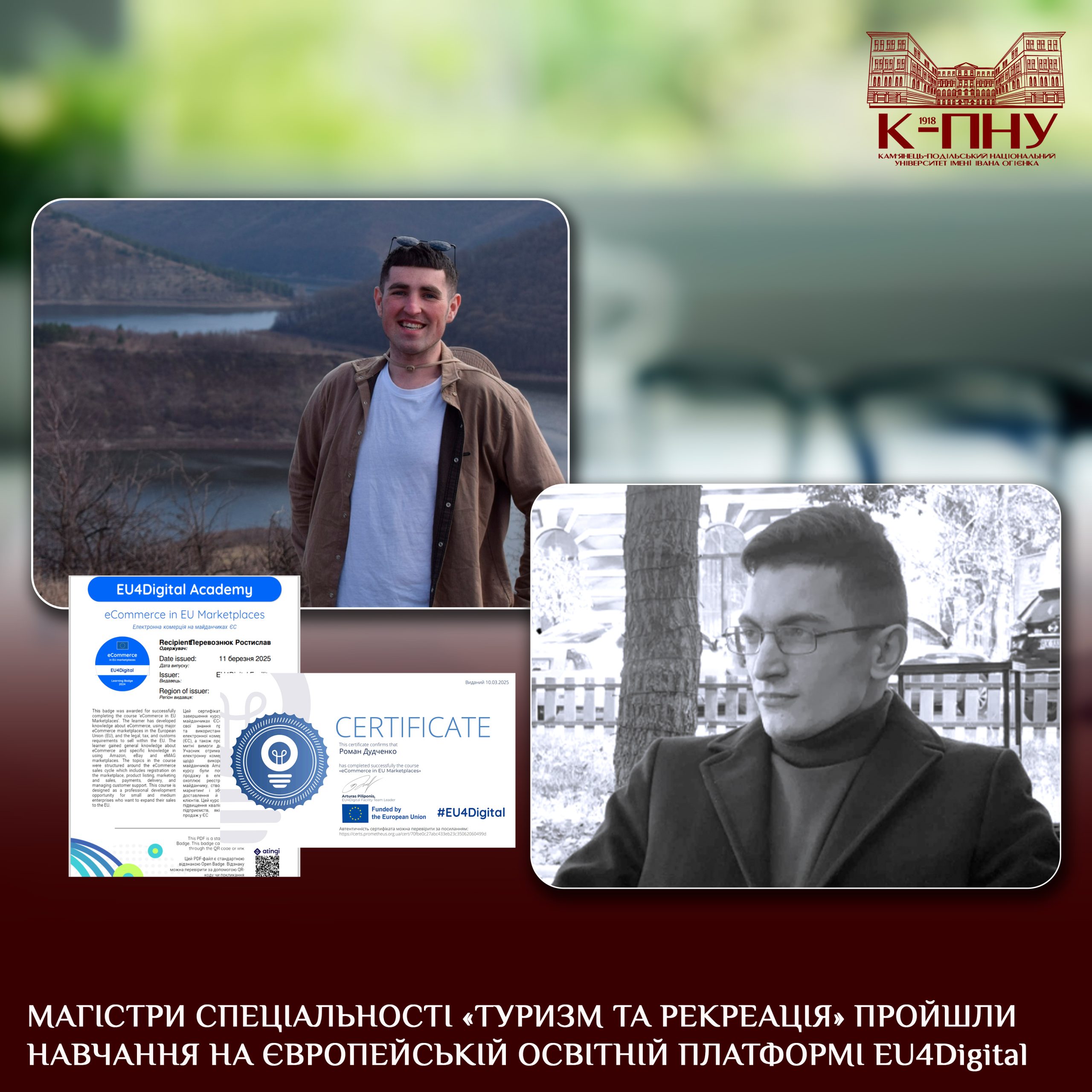 Здобувачі вищої освіти другого (магістерського) рівня ОПП «Туристичний бізнес та індустрія гостинності» Ростислав Перевознюк та Роман Дудченко успішно пройшли навчання на європейській освітній платформі Академії EU4Digital за курсом «Майданчики електронної комерції в ЄС» та отримали сертифікати, що відповідають вимогам ЄС.  Академія була створена у квітні 2024 р. для України, Азербайджану, Вірменії, Грузії та Молдови. У перспективі Академією заплановано впровадження курсів «Цифровий маркетинг» і «Цифровізація бізнесу».