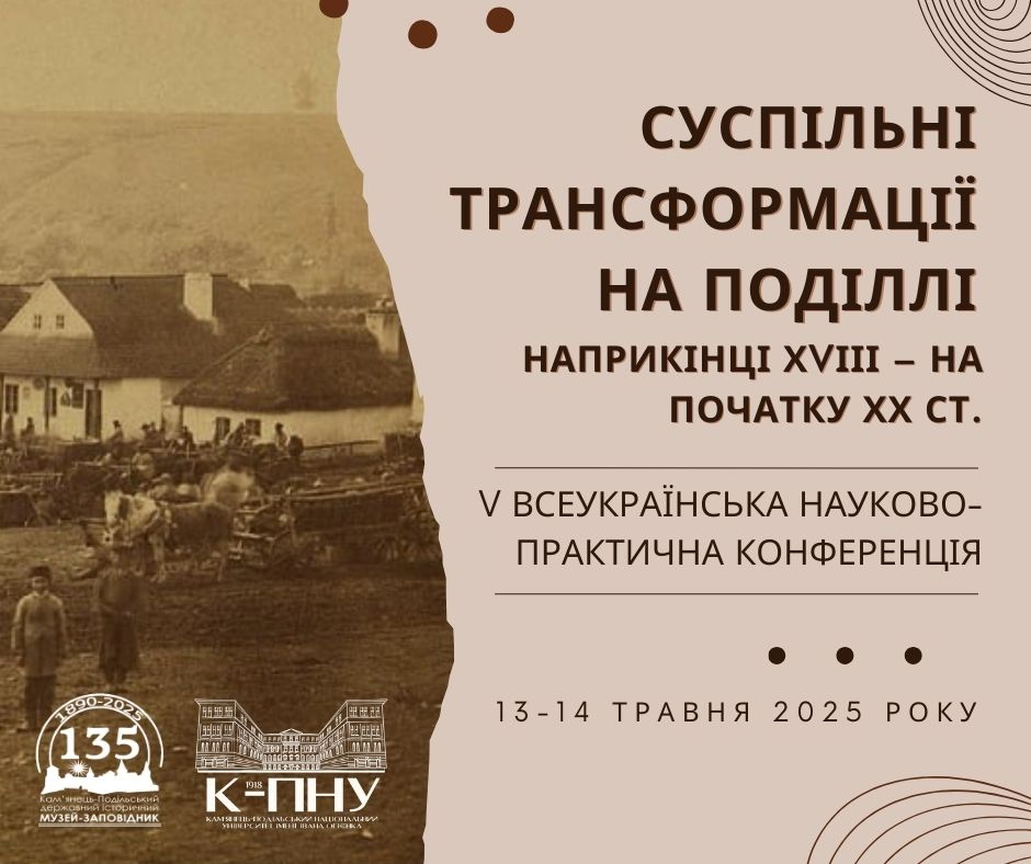 Запрошуємо Вас взяти участь у роботі V Всеукраїнської науково-практичної конференції «Суспільні трансформації на Поділлі наприкінці ХVІІІ – на початку ХХ ст.». Форум відбудеться 13-14 травня 2025 року на базах Кам’янець-Подільського національного університету імені Івана Огієнка і Кам’янець-Подільського державного історичного музею-заповідника.