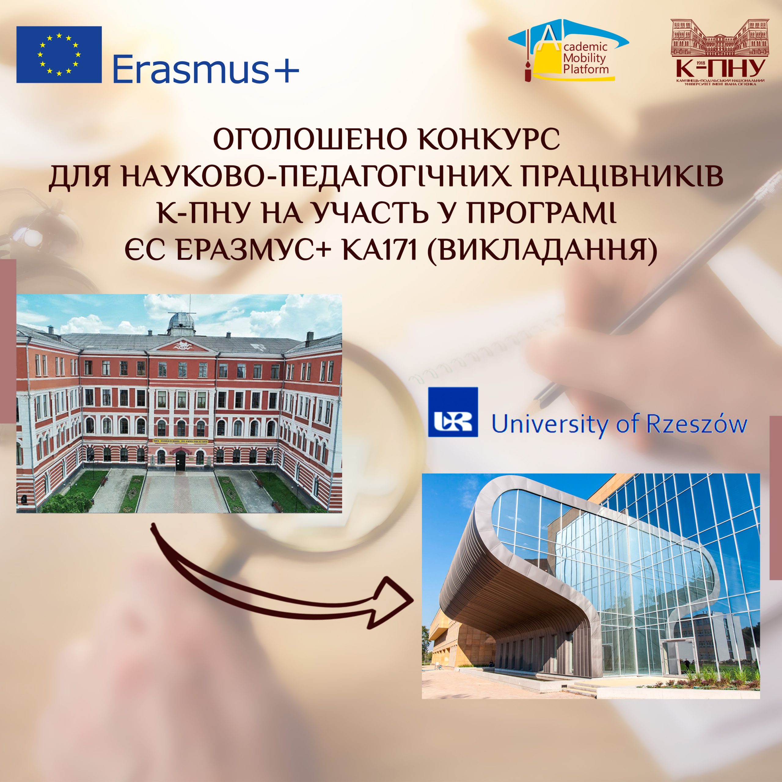 У межах підписаної міжінституційної угоди з  Університетом Жешува (м. Жешув, Польща) оголошено конкурс на участь у Програмі ЄС Еразмус+ КА171: міжнародна кредитна мобільність для науково-педагогічних працівників Університету Огієнка.