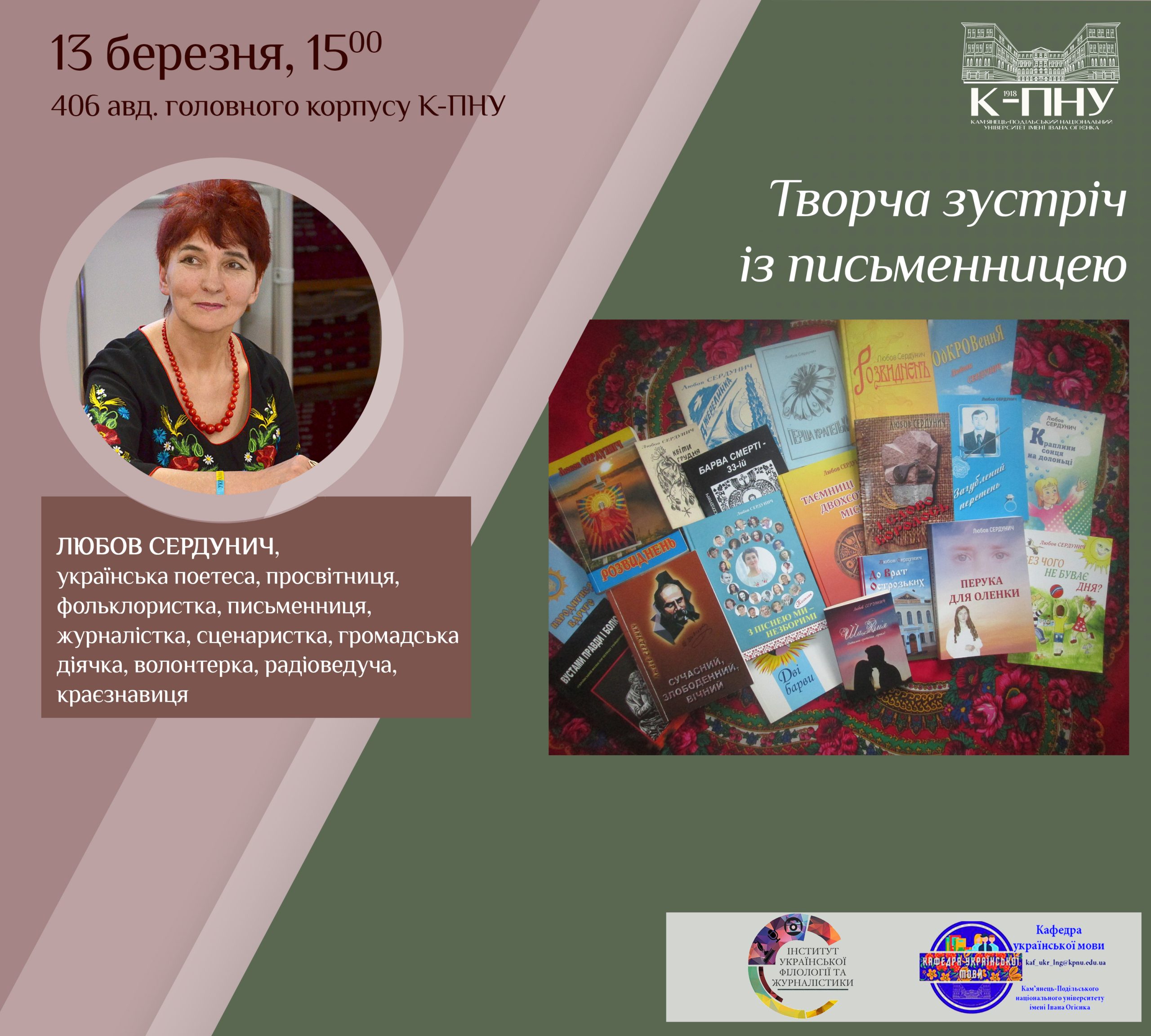 13 березня о 15:00 відбудеться творча зустріч із українською письменницею Любов’ю Сердунич у межах розмовного клубу «Спілкуємось українською».